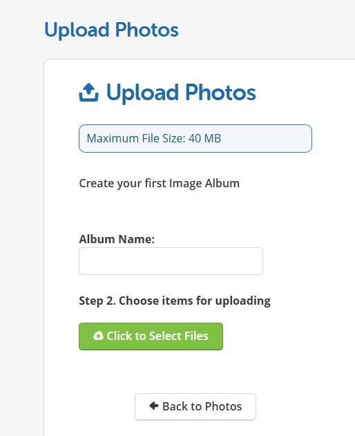 Click on “Media”, then click on “Upload Your First Photo”, Label Album and “Click to Select Files”…that will bring you to you computer files.  From there, you can select pictures to upload to your album.